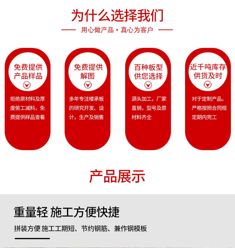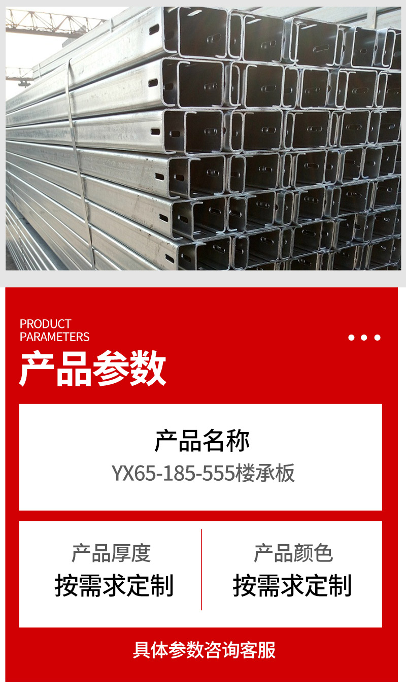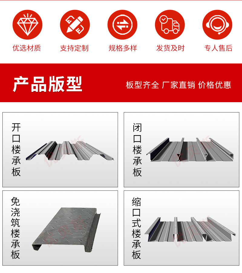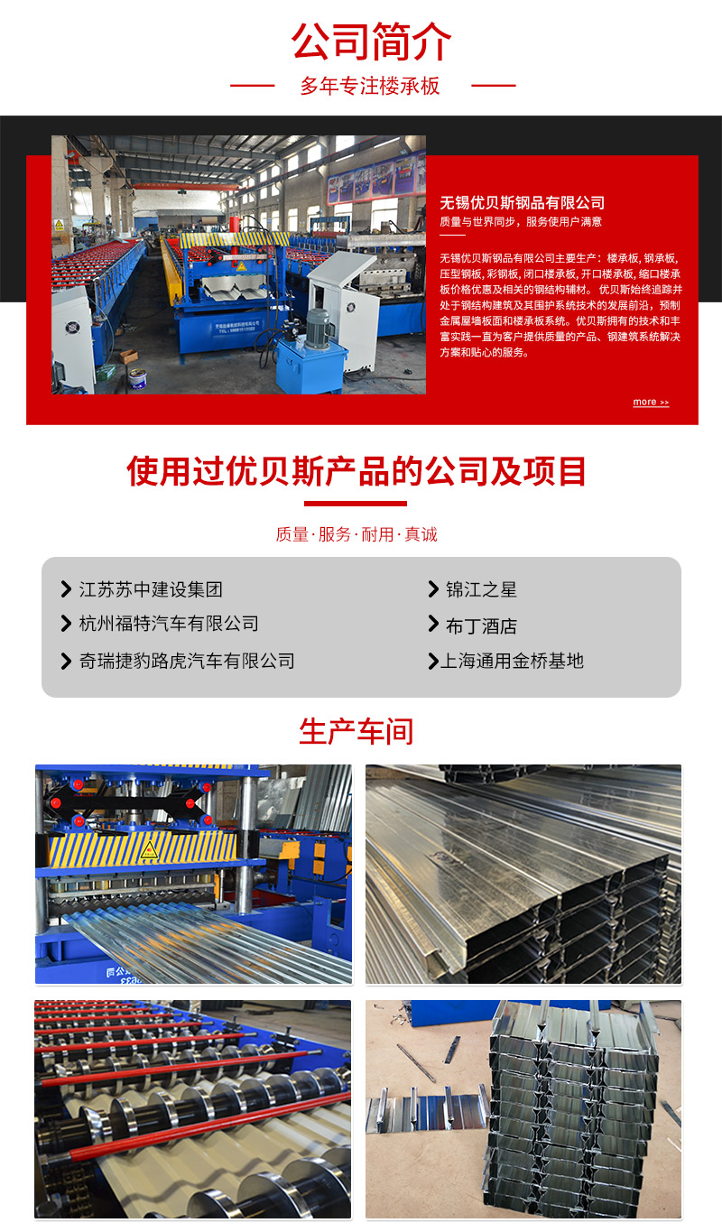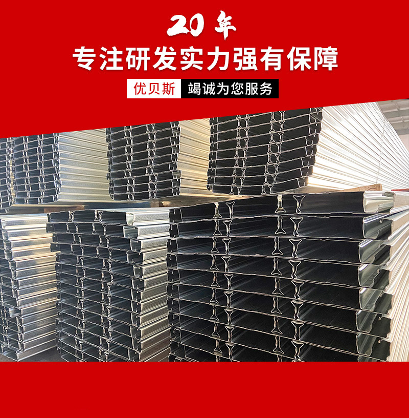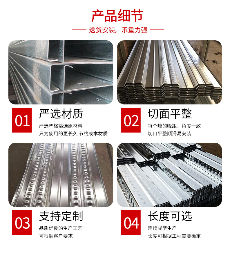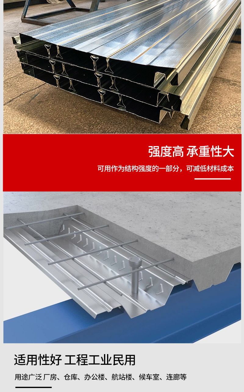 采用鍍鋅鋼板經(jīng)輥壓冷彎制作成型,施工鋪設(shè)后適于澆筑混凝土,與混凝土共同作用聯(lián)合形成一個(gè)樓面整體,是建筑鋼結(jié)構(gòu)工程中僅次于梁柱的主體部分,用于樓蓋的永久性支撐模板。