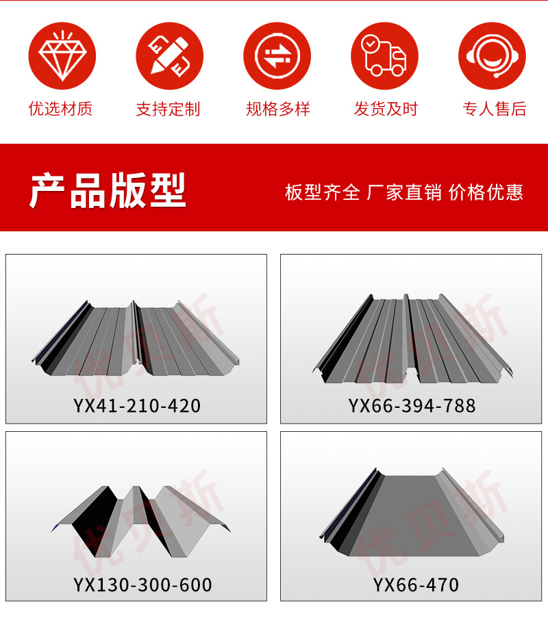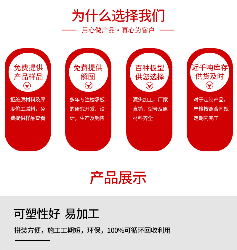 采用鍍鋅鋼板經輥壓冷彎制作成型,施工鋪設后適于澆筑混凝土,與混凝土共同作用聯(lián)合形成一個樓面整體,是建筑鋼結構工程中僅次于梁柱的主體部分,用于樓蓋的永久性支撐模板。